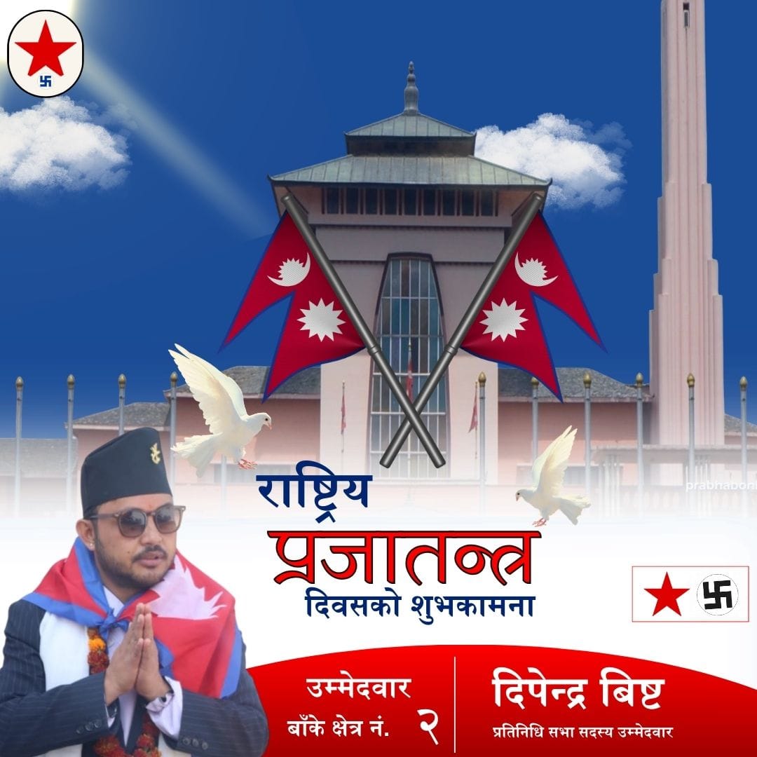 सबिता चन्द नेपालगन्ज । राष्ट्रिय प्रजातन्त्र दिवसको अवसरमा बाँके क्षेत्र नं. २ प्रतिनिधि सभा सदस्य पदका उम्मेदवार दिपेन्द्र बिष्ट ले सम्पूर्ण देशवासी तथा बाँकेवासीमा शुभकामना व्यक्त गर्नुभएको छ। लोकतन्त्र प्राप्तिका ऐतिहासिक संघर्ष र बलिदानको स्मरण गर्दै उहाँले प्रजातन्त्रको रक्षा, सुदृढीकरण