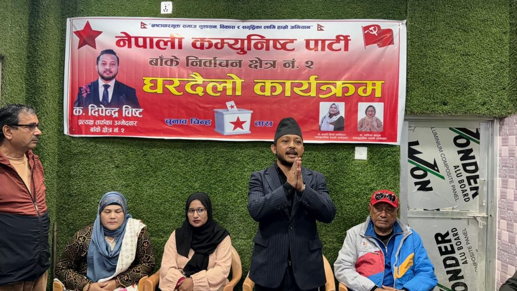 नेपालगन्ज। बाँके क्षेत्र नं. २ का प्रतिनिधि सभा सदस्य पदका उम्मेदवार दिपेन्द्र बिष्ट आज बिहानैदेखि नेपालगन्ज उपमहानगरपालिका वडा नं. ३ का मतदाता भेटघाटमा सक्रिय रहनुभएको छ। घरदैलो र प्रत्यक्ष संवादमार्फत मतदाताको आशिर्वाद लिँदै उहाँले दीर्घकालीन खानेपानी समस्या समाधान गर्ने स्पष्ट प्रतिबद्धता व्यक्त गर्नुभएको हो।