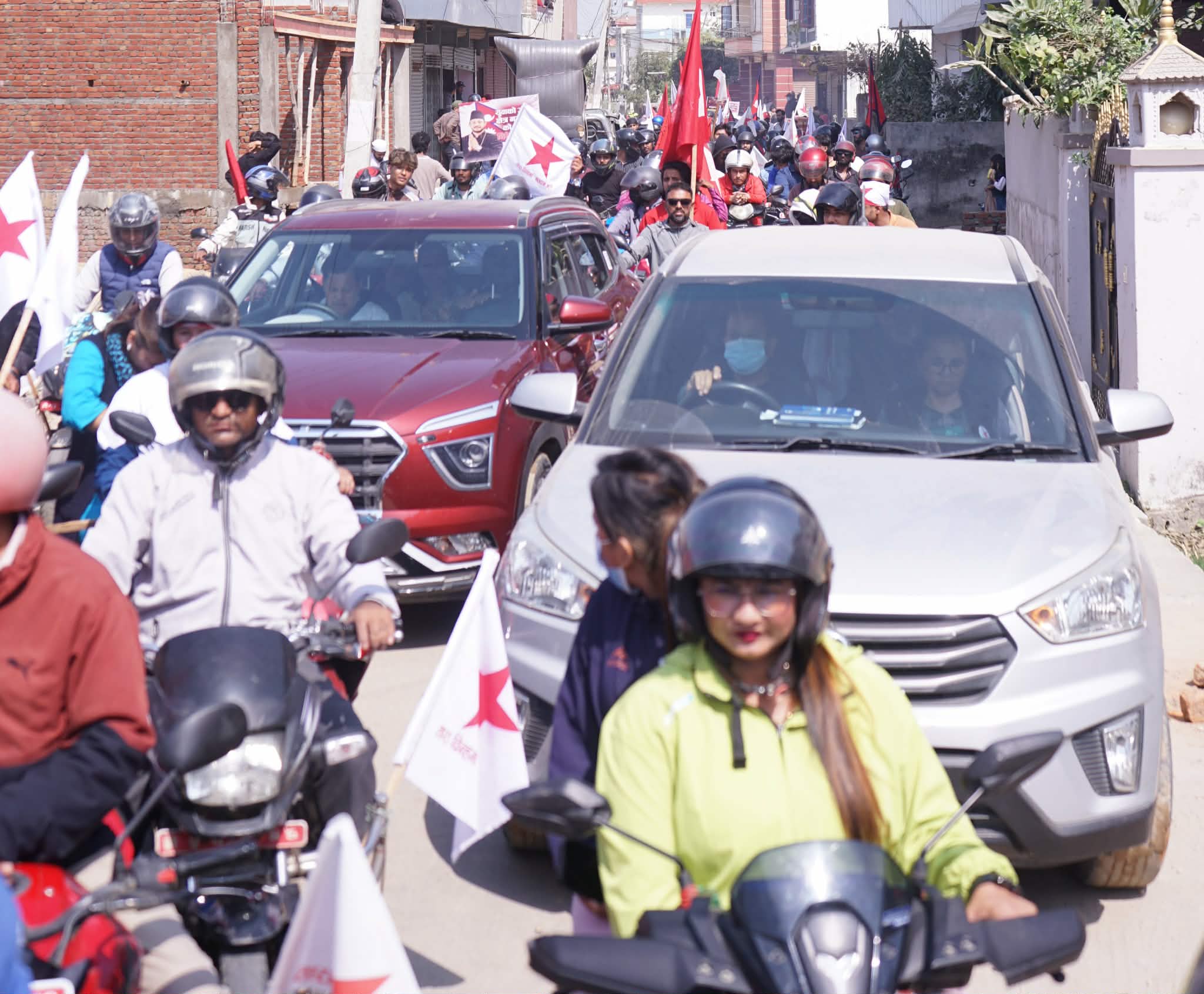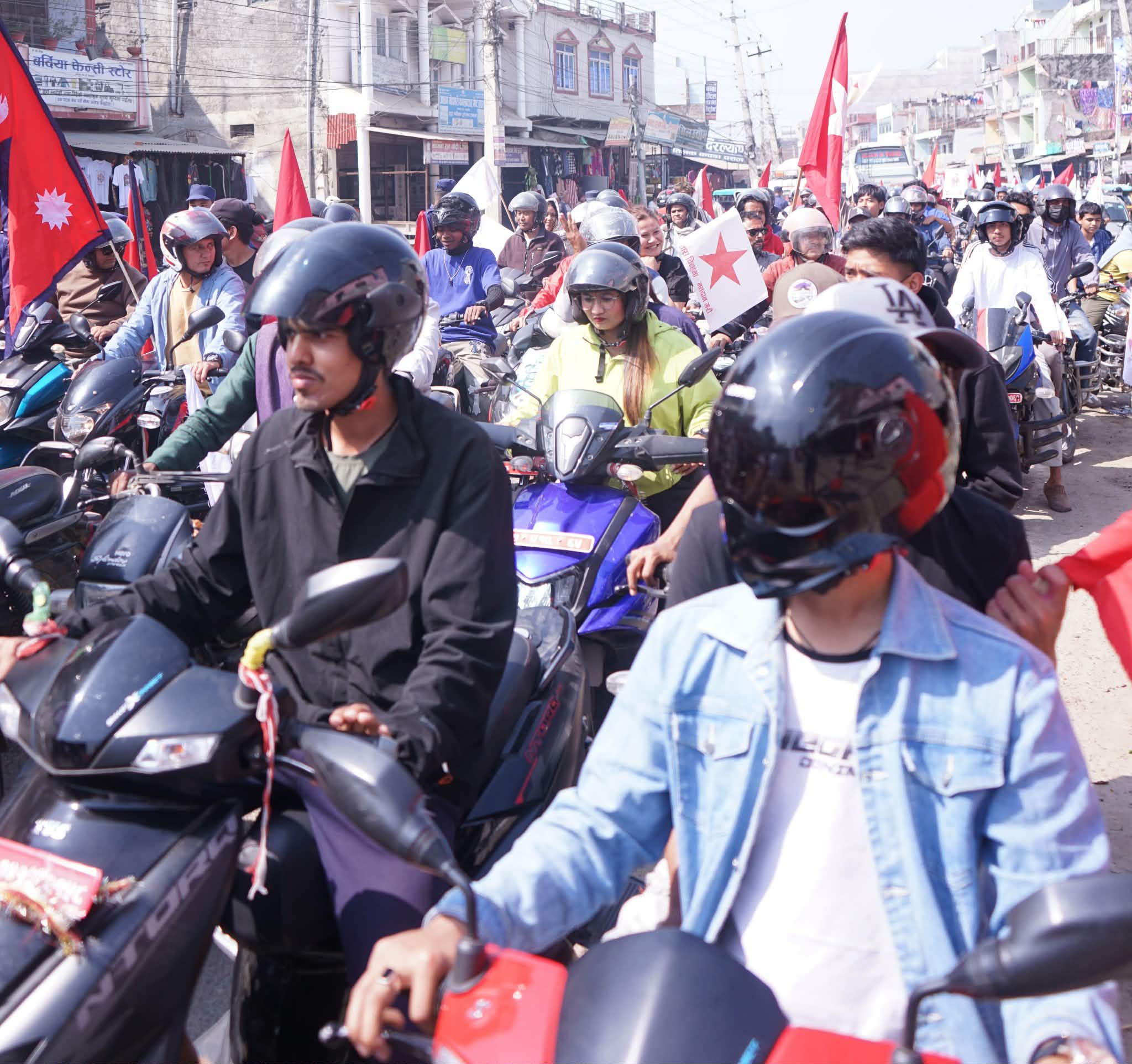 नेपालगन्ज । आगामी फागुन २१ गते हुन गइरहेको प्रतिनिधि सभा निर्वाचनलाई लक्षित गर्दै नेपाली कम्युनिस्ट पार्टी बाँके क्षेत्र नं. २ ले बृहत मोटरसाइकल र्याली प्रदर्शन गरेको छ। चुनावी सरगर्मी उत्कर्षमा पुगेका बेला गरिएको यो शक्तिप्रदर्शनले नेपालगन्जको मुख्य सडक र गल्लीहरू उत्साहले भरिएका थिए।