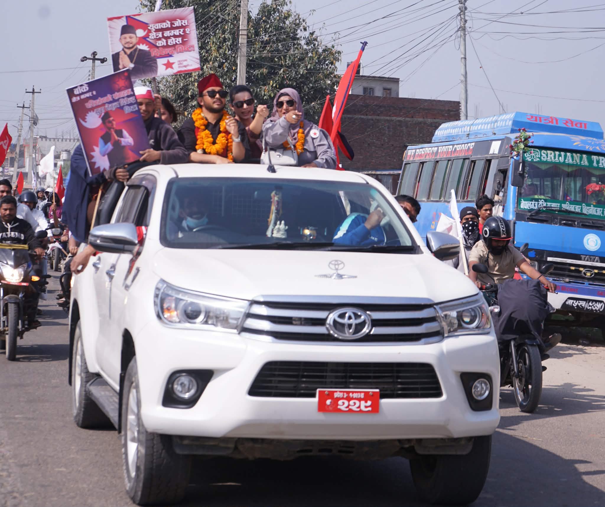 र्यालीमा बाँके क्षेत्र नं. २ का प्रतिनिधि सभा सदस्य पदका उम्मेदवार युवा नेता दिपेन्द्र बिष्टलाई गाडीको पछाडिको डालामा उभ्याइएको थियो। हजारभन्दा बढी मोटरसाइकलसहित समर्थकहरूले नेपालगन्ज परिक्रमा गर्दै नाराबाजी र अभिवादनमार्फत समर्थन व्यक्त गरेका थिए।