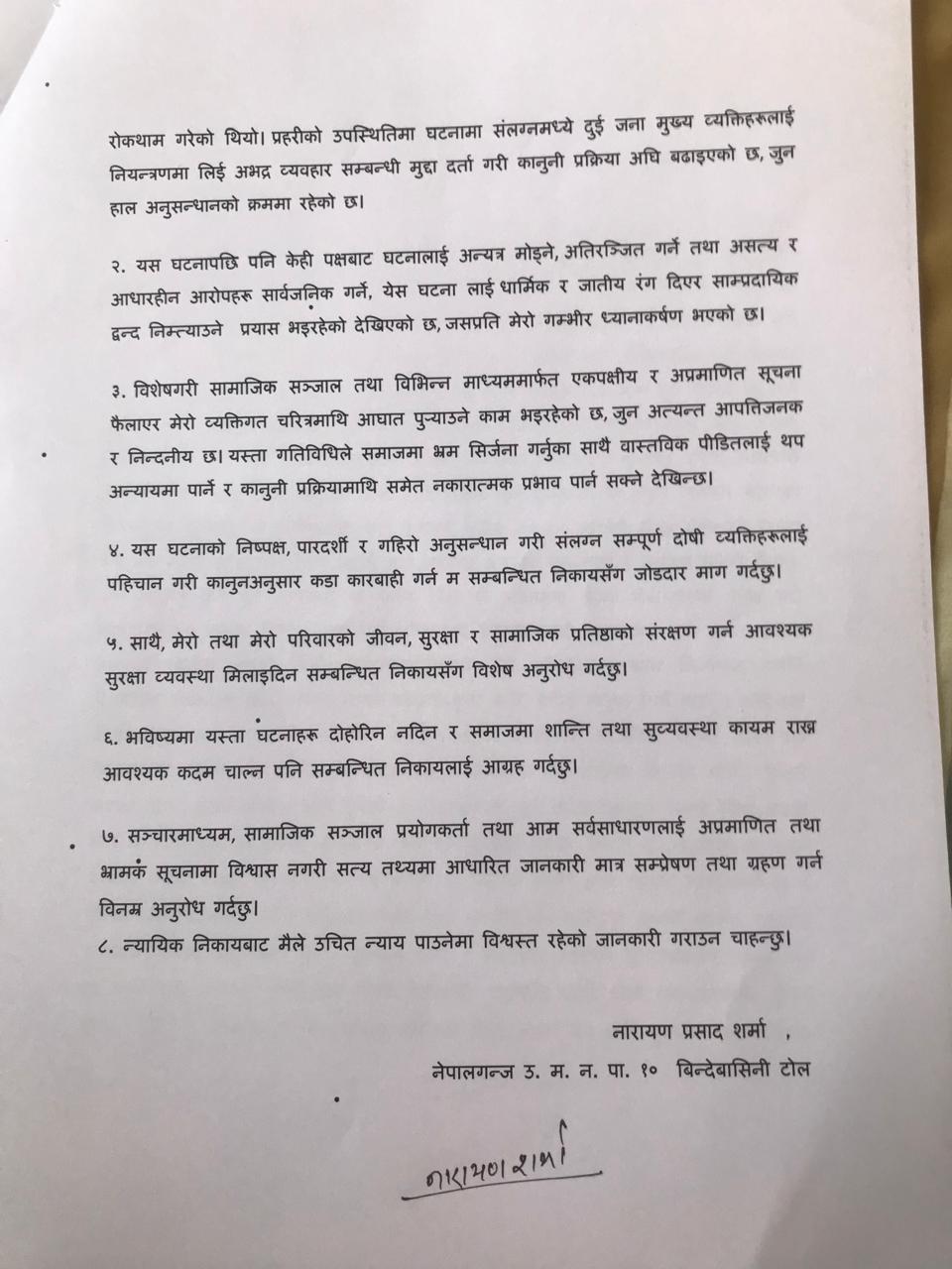 पीडित शर्माले निष्पक्ष, पारदर्शी र गहिरो अनुसन्धानको माग गर्दै दोषीलाई कानुनी दायरामा ल्याउन सम्बन्धित निकायसँग आग्रह गरिएको छ । साथै, आफ्नो परिवारको सुरक्षा सुनिश्चित गर्न र भविष्यमा यस्ता घटना दोहोरिन नदिन ठोस कदम चाल्नुपर्ने आवश्यकता औंल्याएका छन्। “सत्य तथ्यमा आधारित सूचना मात्र प्रवाह गरियोस्, भ्रामक प्रचारले समाजमा झन् भ्रम सिर्जना गर्छ,” भन्दै उहाँले सञ्चारमाध्यम र सामाजिक सञ्जाल प्रयोगकर्तासँग जिम्मेवार बन्न अनुरोध गर्नु भएको छ ।