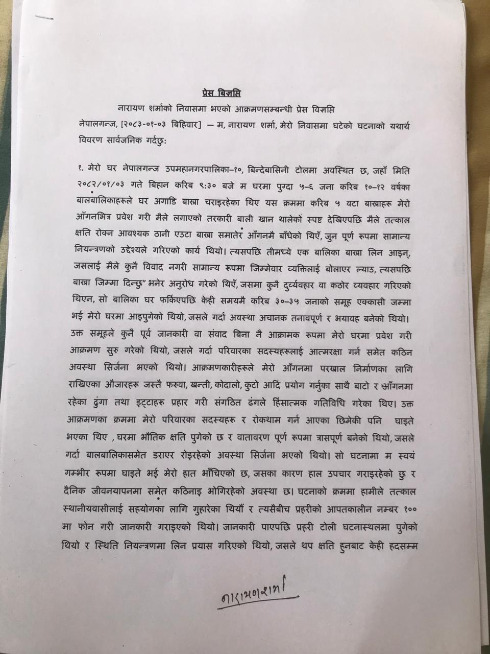 नेपालगन्ज । एक सामान्य झैँ देखिने बालबालिकाबीचको घटना अचानक हिंसात्मक रुप लिँदा नेपालगञ्ज उपमहानगरपालिका–१० स्थित एक परिवार गम्भीर पीडामा परेको छ। स्थानीय बासिन्दा नारायण प्रसाद शर्माले सार्वजनिक गरेको प्रेस विज्ञप्तिअनुसार, २०८२ साल वैशाख ३ गते बिहान करिब ९:३० बजे उहाँको घर अगाडि भएको सामान्य विवादले ठूलो दुर्घटनाको रूप लिएको हो।