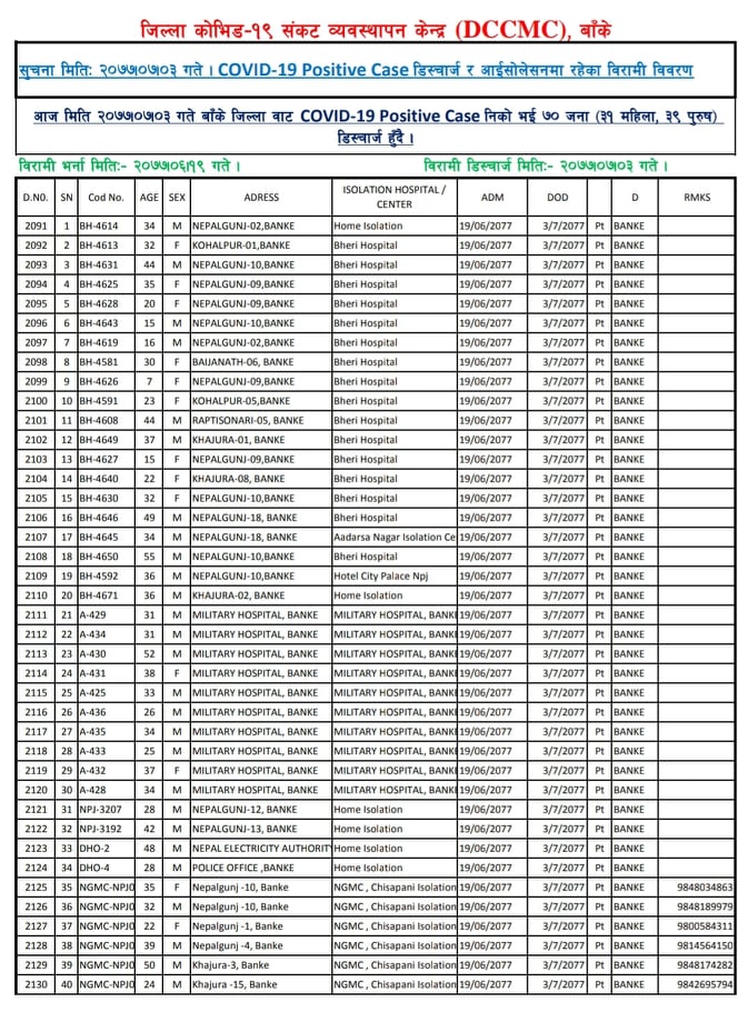 जिल्ला कोभिड– १९ संकट व्यवस्थापन केन्द्र (डी.सीसी.एम.सी) बाँकेका अनुसार आज डिस्चार्ज हुनेमा ३१ जना महिला र ३९ जना पुरुष रहेका छन् । यससँगै जिल्लाभर कोरोना जित्दै डिस्चार्ज हुनेको संख्या दुई हजार १०९ पुगेको छ ।