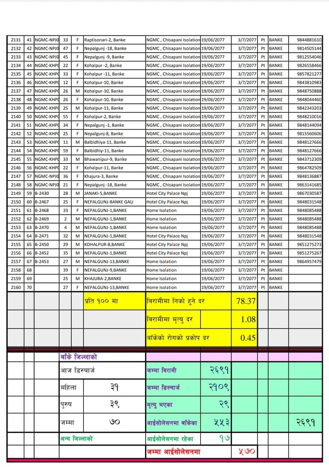 बाँकेमा बिरामी निको हुने दर ७८.३७ प्रतिशत, मृत्यु दर १.०८ प्रतिशत र रोगको प्रकोप दर ०.४५ प्रतिशत रहेको जिल्ला कोभिड– १९ संकट व्यवस्थापन केन्द्र (डी.सीसी.एम.सी) बाँकेले जनाएको छ ।