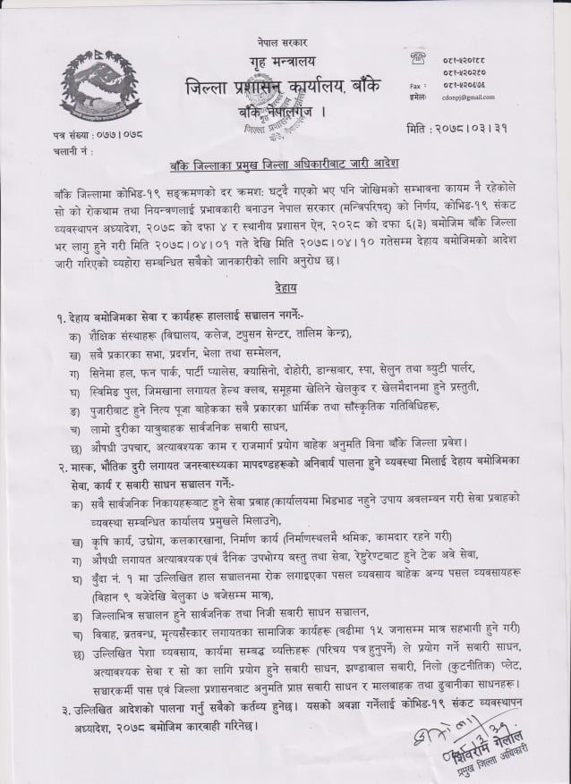 जिल्ला प्रशासन कार्यालय बाँकेले आज जारी गरेको आदेश अनुसार कोभिड जोखिम कायमै भएकाले साउन १ गतेदेखी १० गतेसम्म विद्यालय लगायतका शैक्षिक संस्थाहरु संञ्चालनमा रोक लगाईएको हो ।
