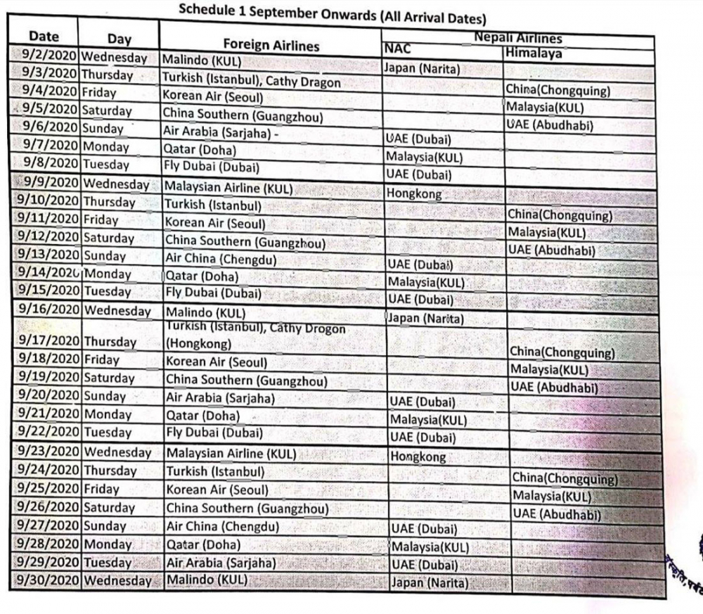 यो एक महिनाको अवधिमा १० वटा विदेशी र दुईटा नेपाली गरी १२ वटा वायुसेवाले ६० वटा उडान गर्ने छन् । सरकारले दैनिक ५ सयसम्म मात्रै यात्रु ल्याउन दिने कोटा तोकेकाले यो तालिका हेरफेर हुन सक्ने मन्त्रालयका एक अधिकारीले बताए ।